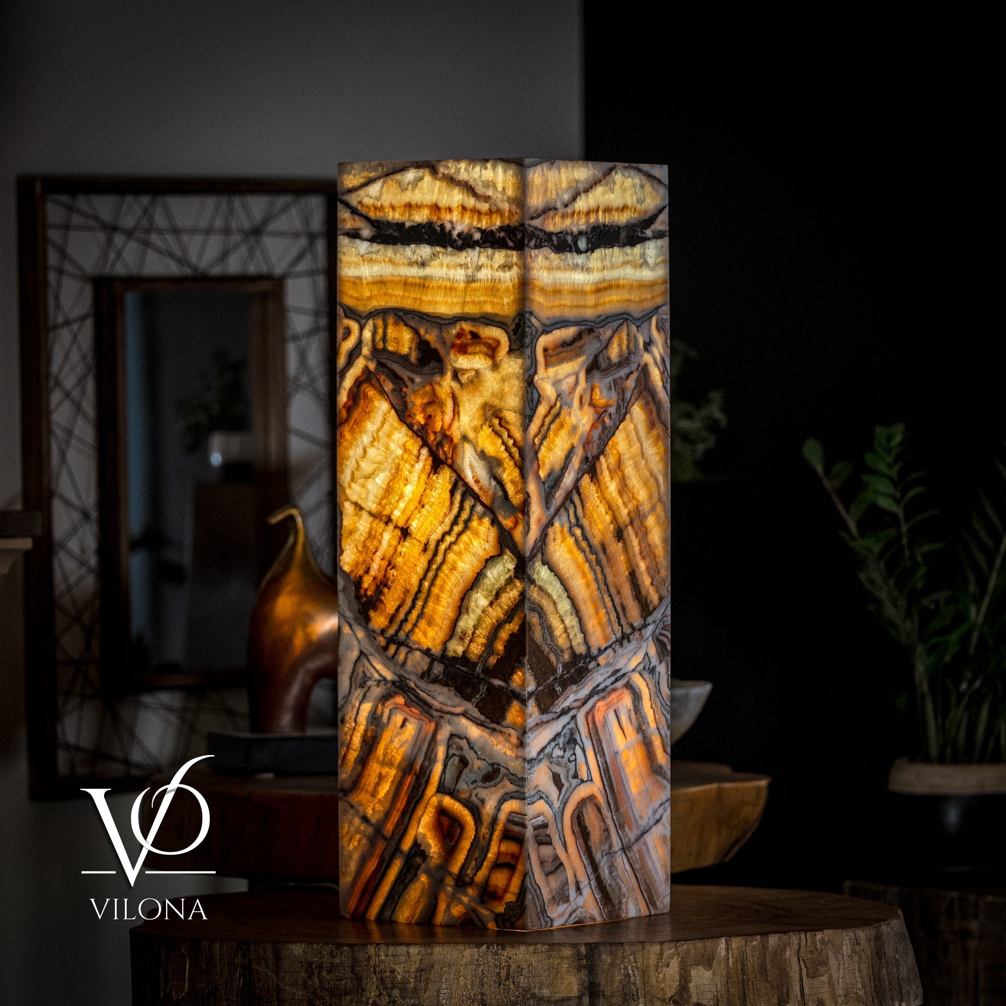 With patterns and colors that are truly breathtaking, the Vilona family features many unique lamp designs and large agate inlaid tables. The stunning contrast of golden hues and beige bands of the stone will add a touch of elegance to any room.
