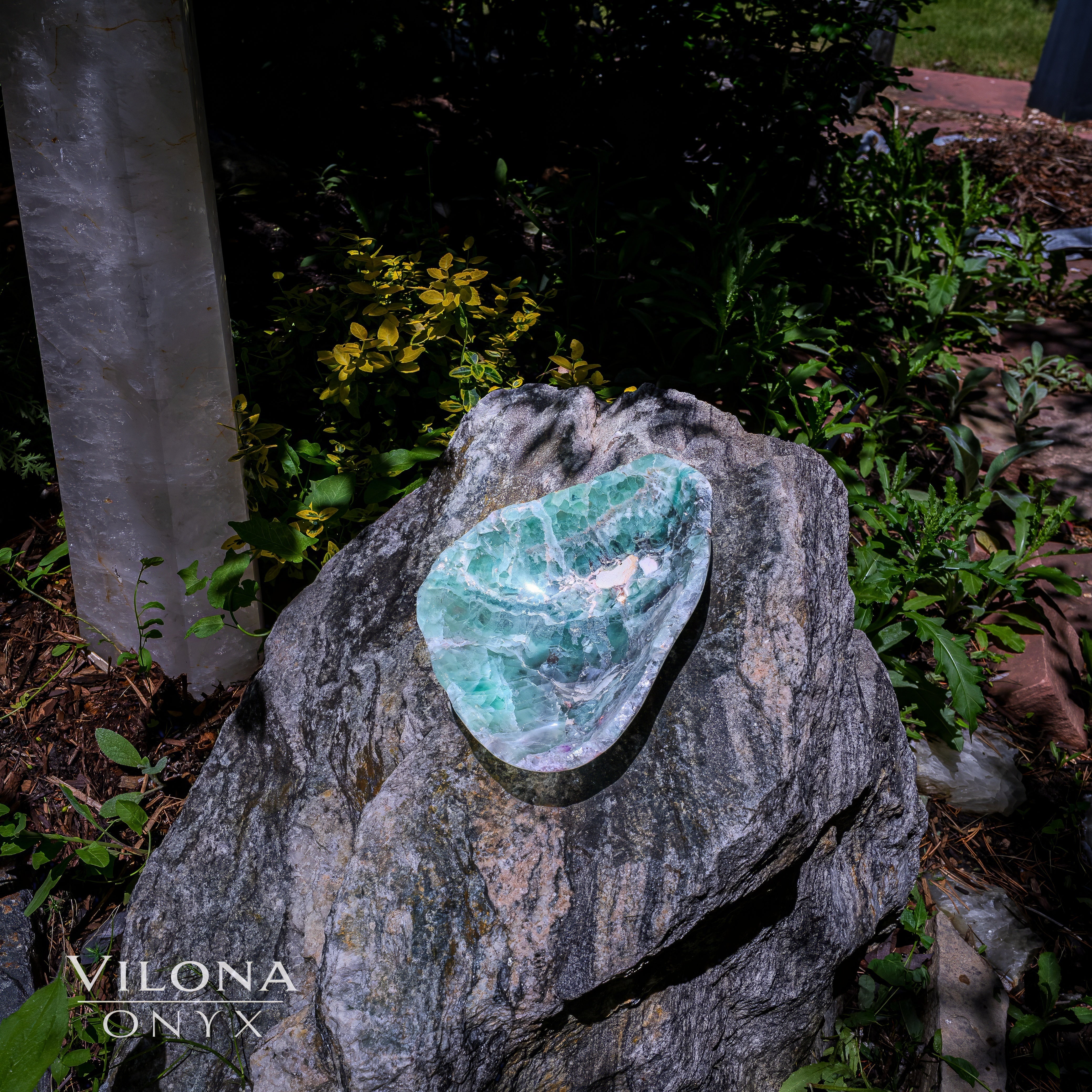 We are proud to present our latest in the Fluorite Bowls Collection—a stunning showcase of artistry handcrafted by the Vilona family. This exquisite hand carved bowl features elegant design that celebrates the natural beauty of vibrant green/purple Fluorite.