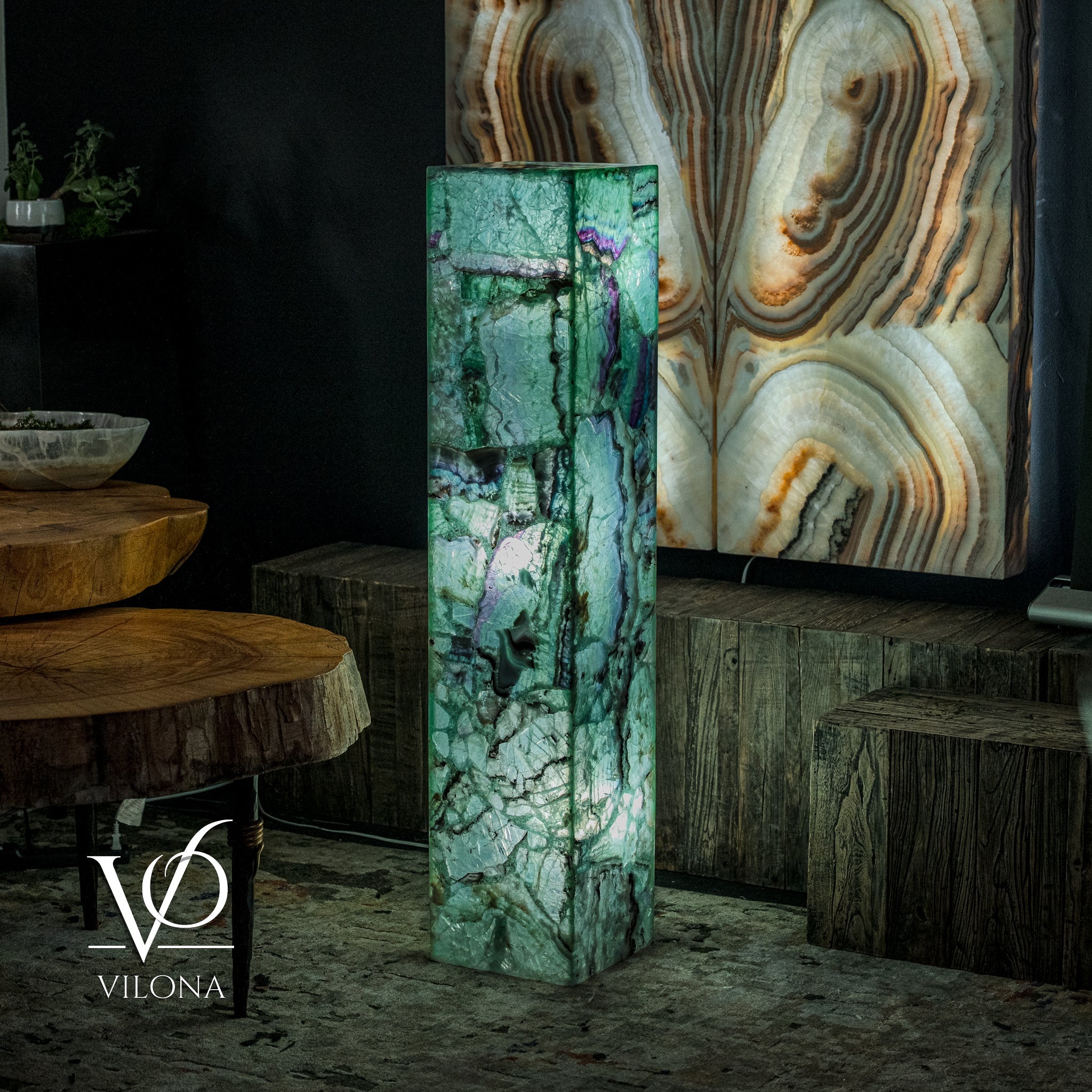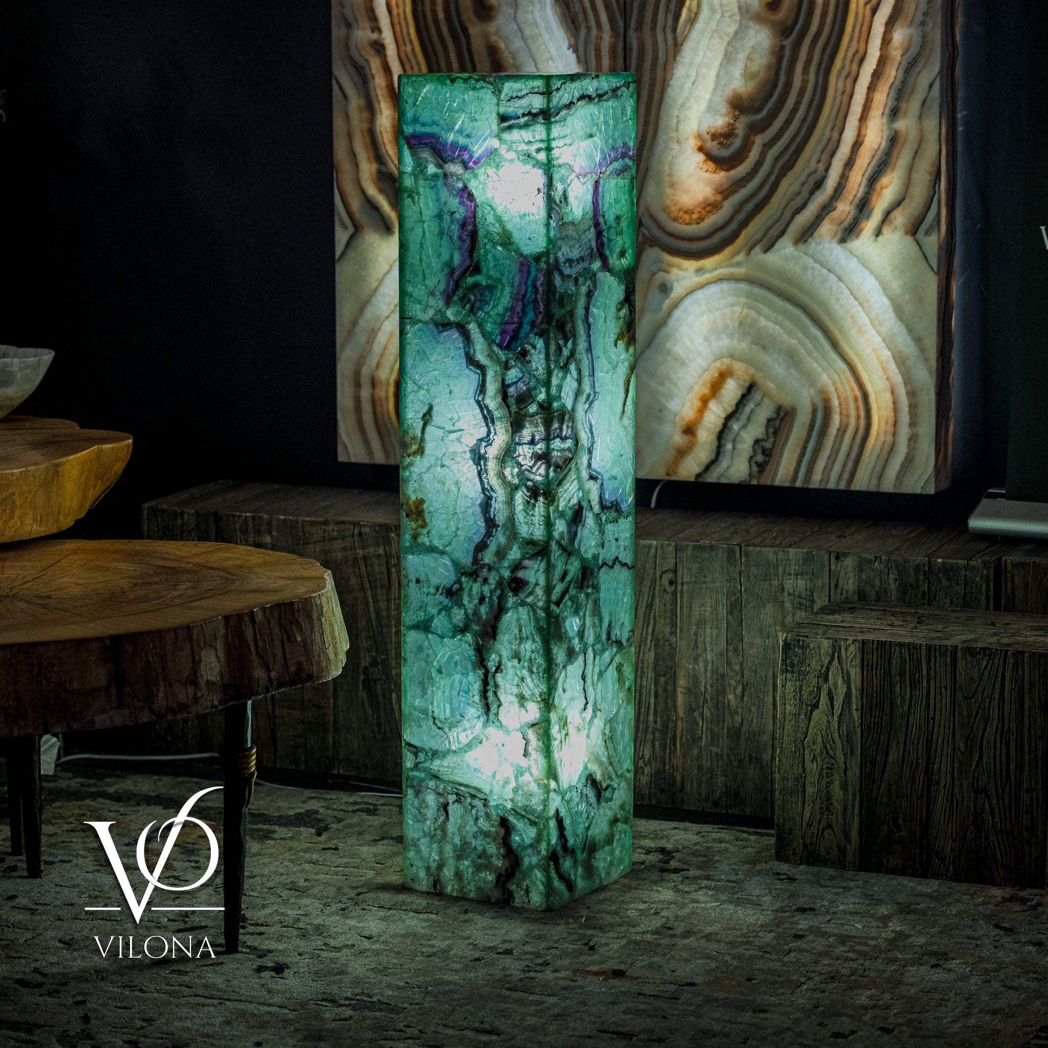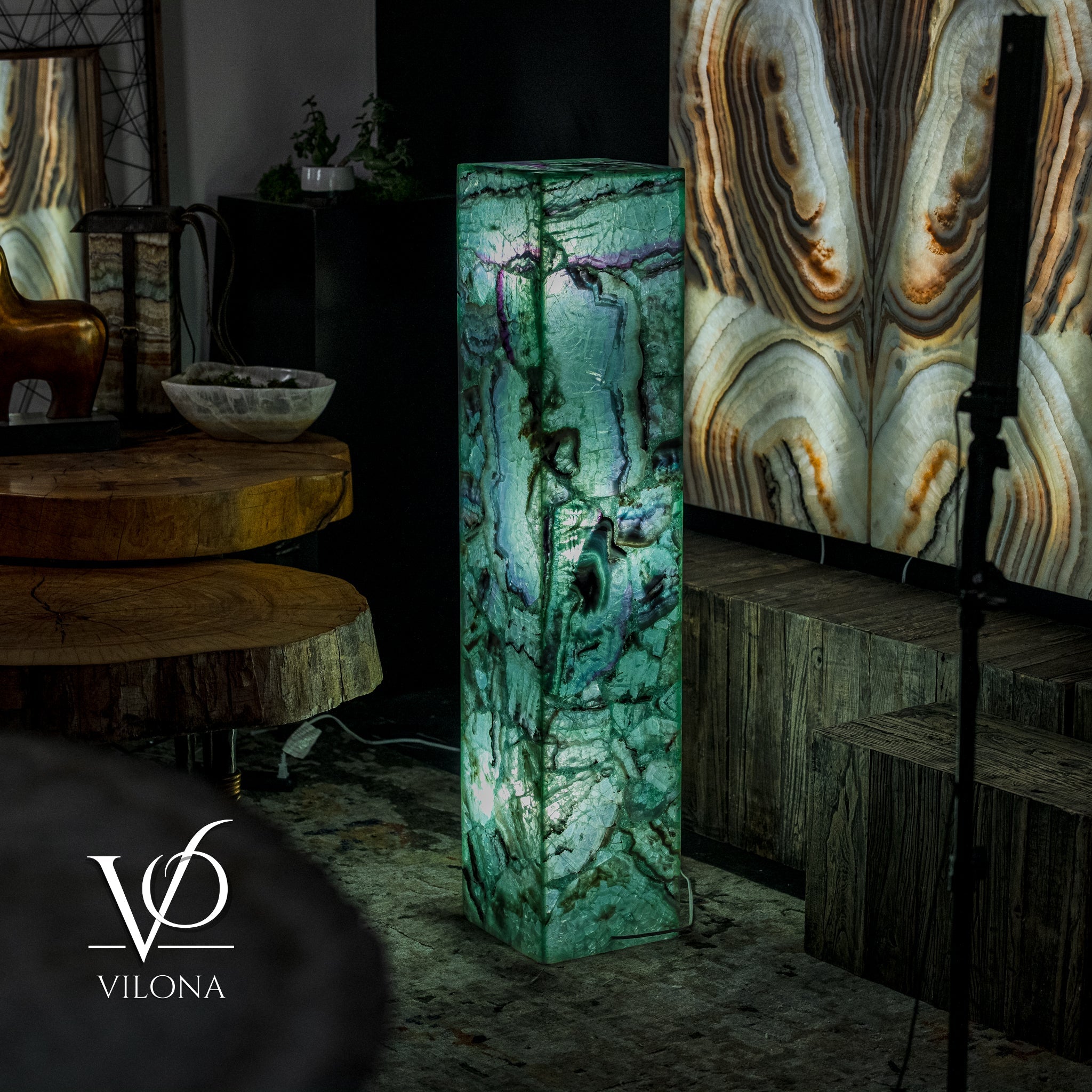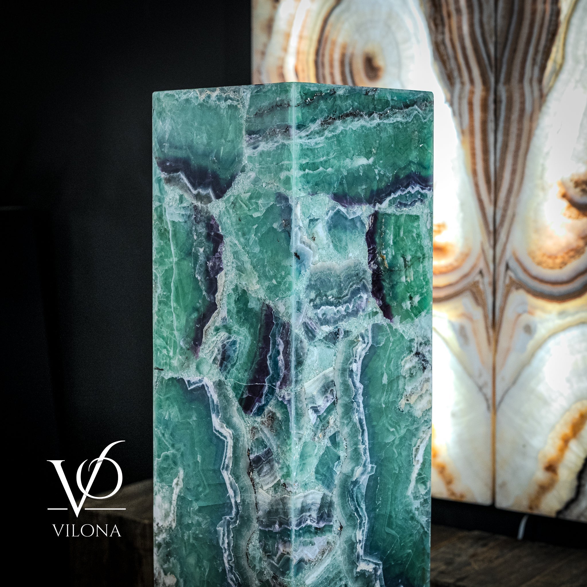 Say hello to our Fluorite Towers Collection - handmade art pieces by the Vilona family. We've made some beautiful lamps and bowls from bright green fluorite and deep onyx stone, which we get from our trusted quarry of 45 years.