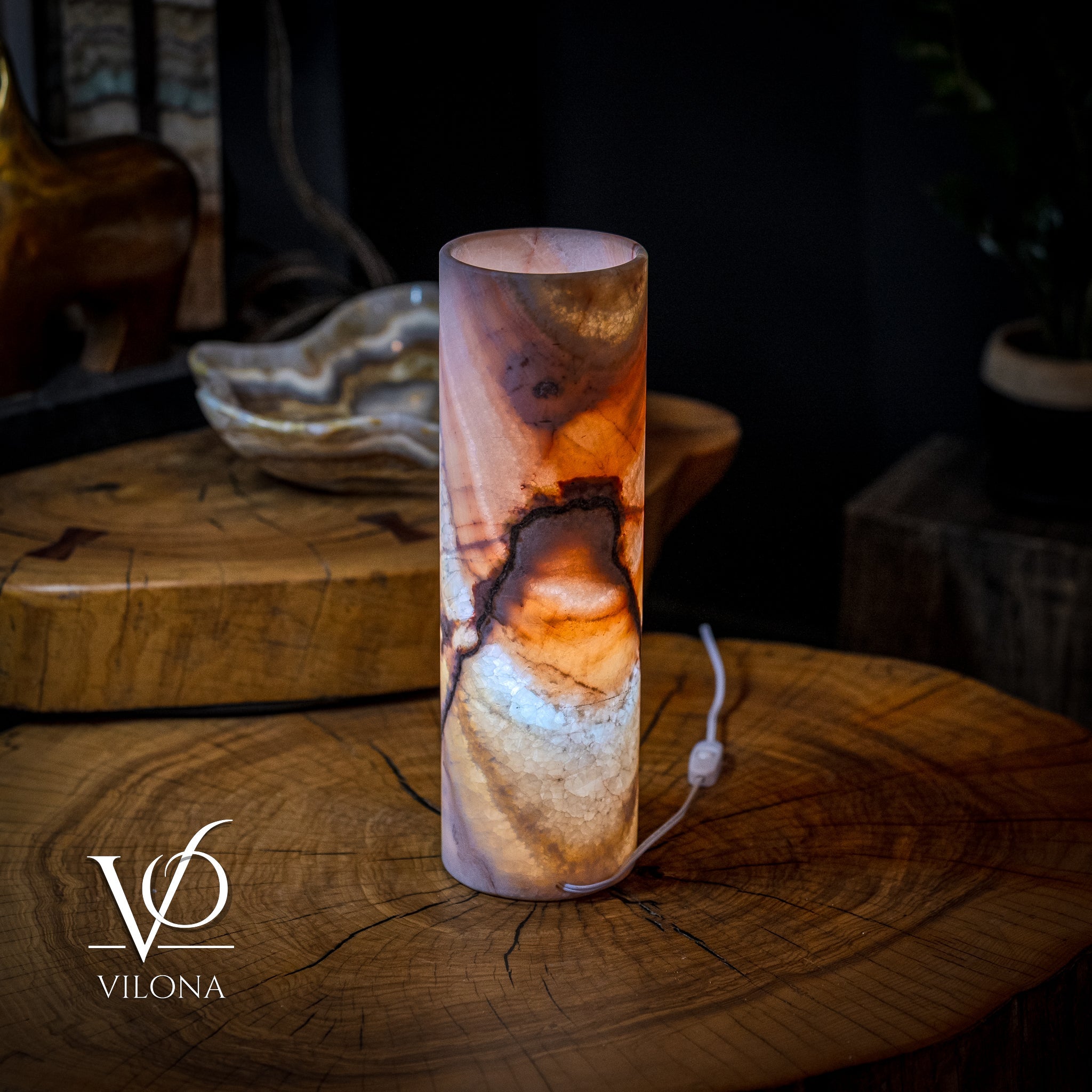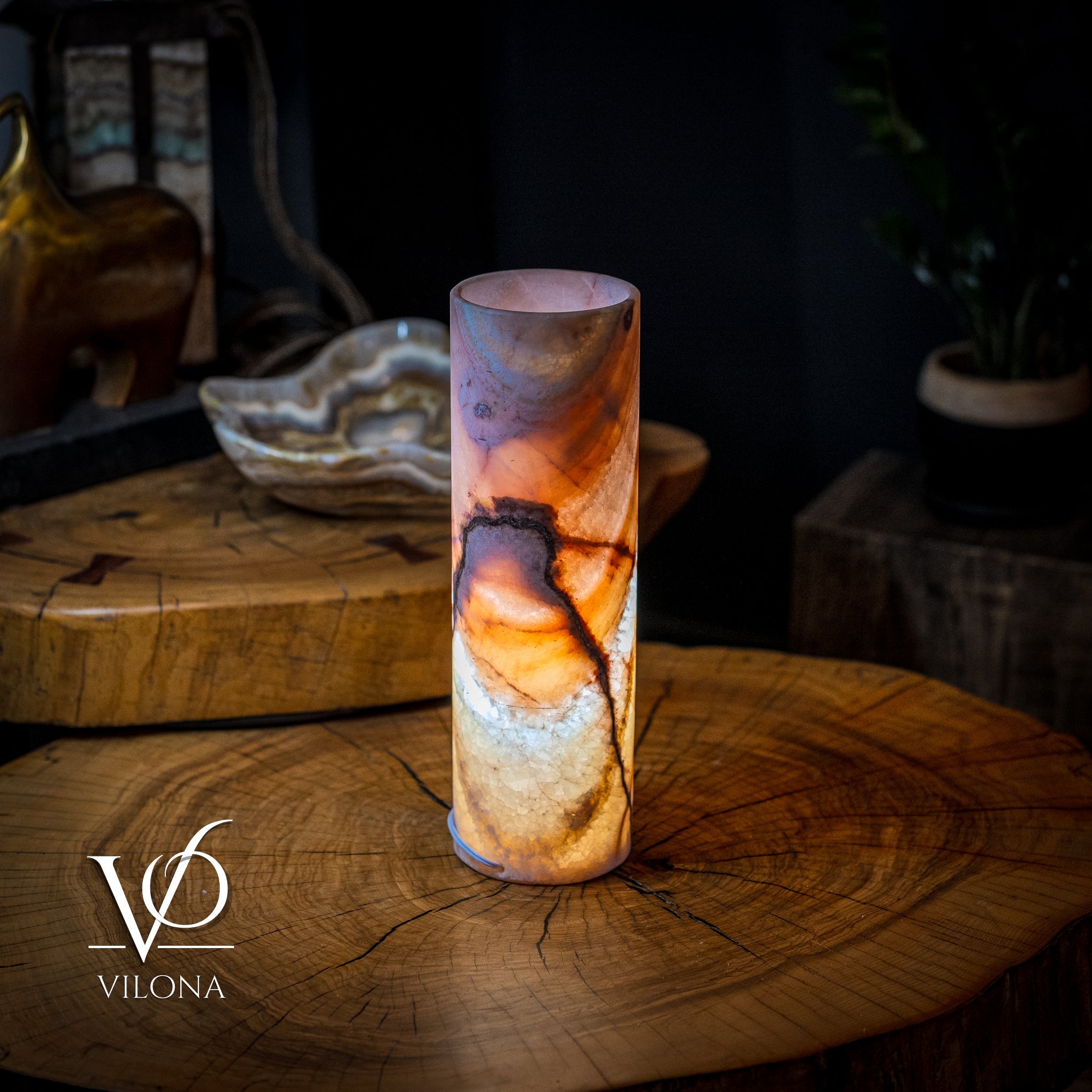 At Vilona Onyx, our lamps are more than lighting; they are handcrafted sculptures carved from world-class stone. Every Razzberry Rosa lamp is shaped and polished to highlight the stone’s natural translucence, allowing the lamp to emit a warm, captivating glow that transforms your space with elegance and depth.