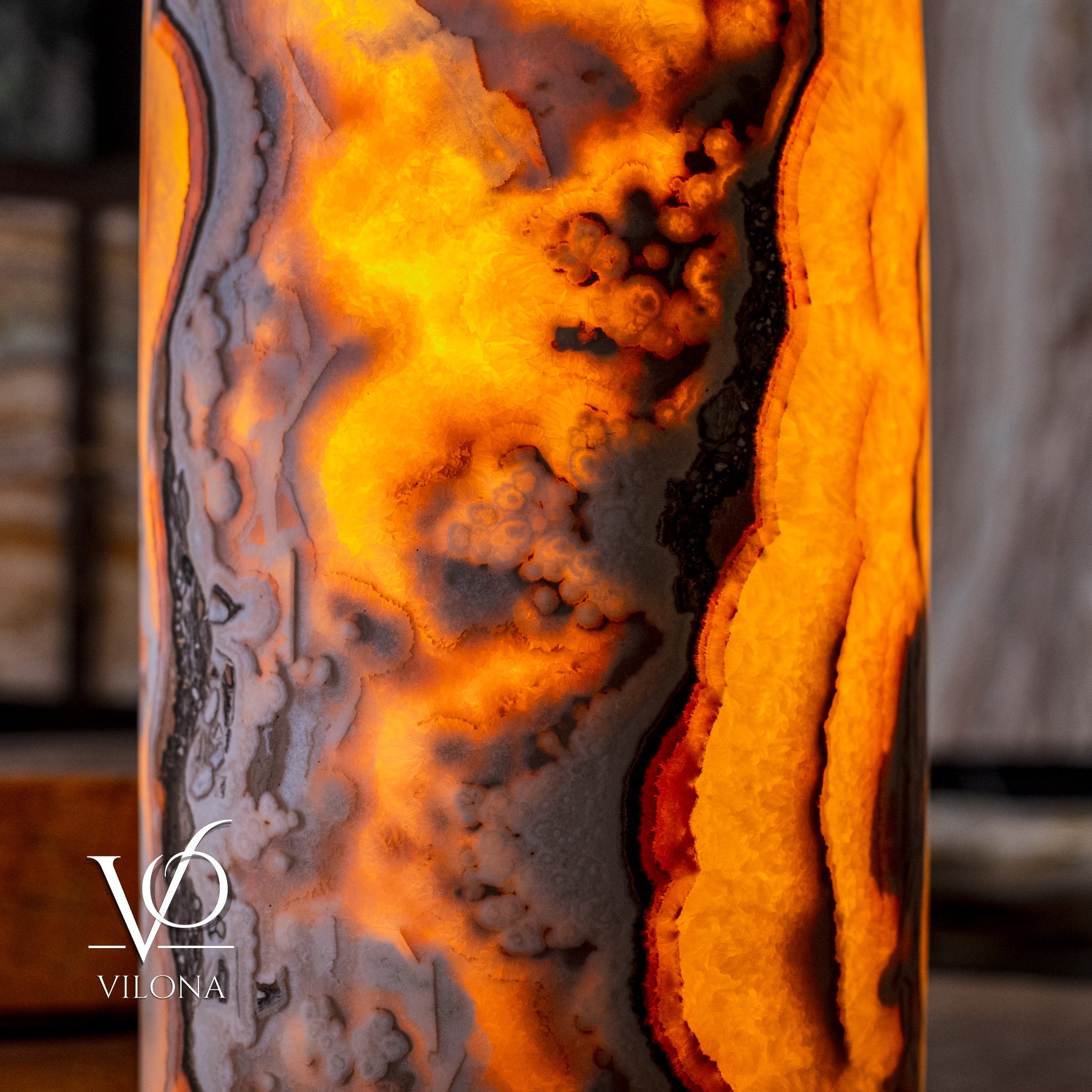 With patterns and colors that are truly breathtaking, the Vilona family features many unique lamp designs and large agate inlaid tables. The stunning contrast of golden hues and beige bands of the stone will add a touch of elegance to any room.