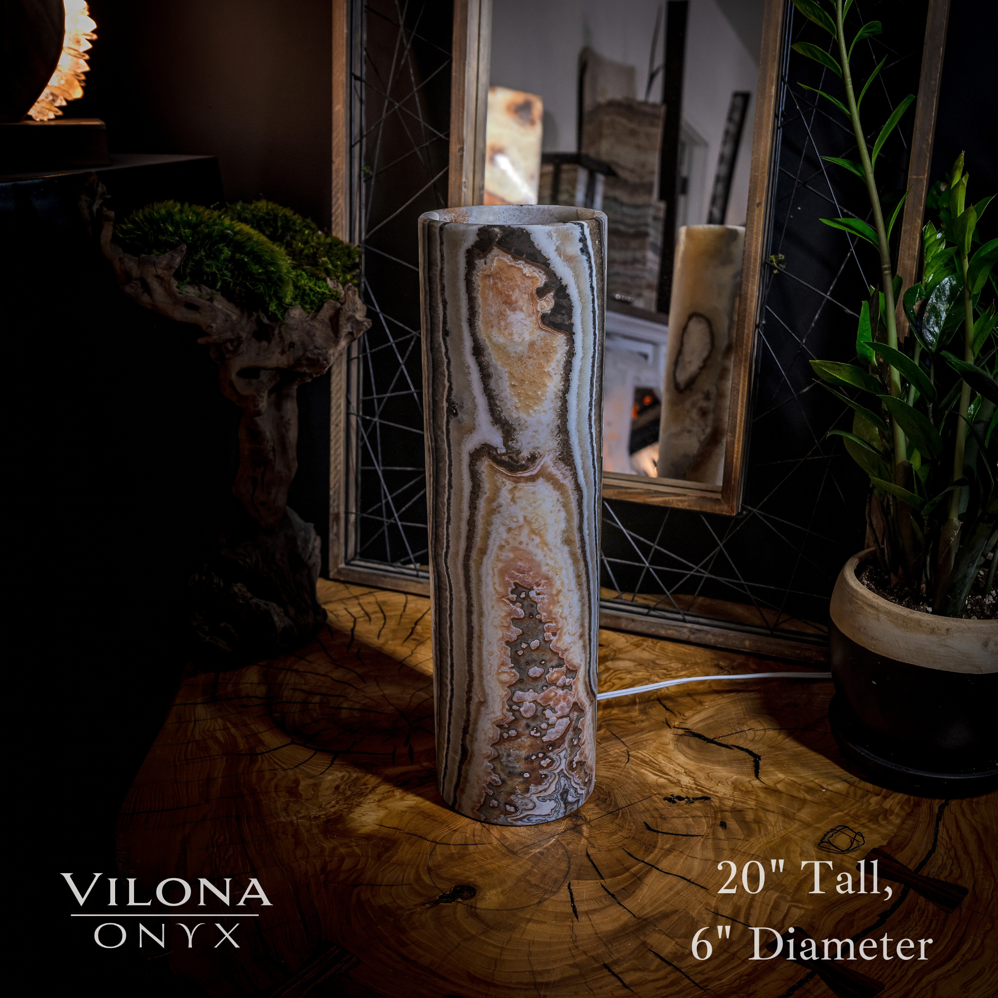 The onyx lamp displayed in this listing (20" Tall, x 6" Diameter)