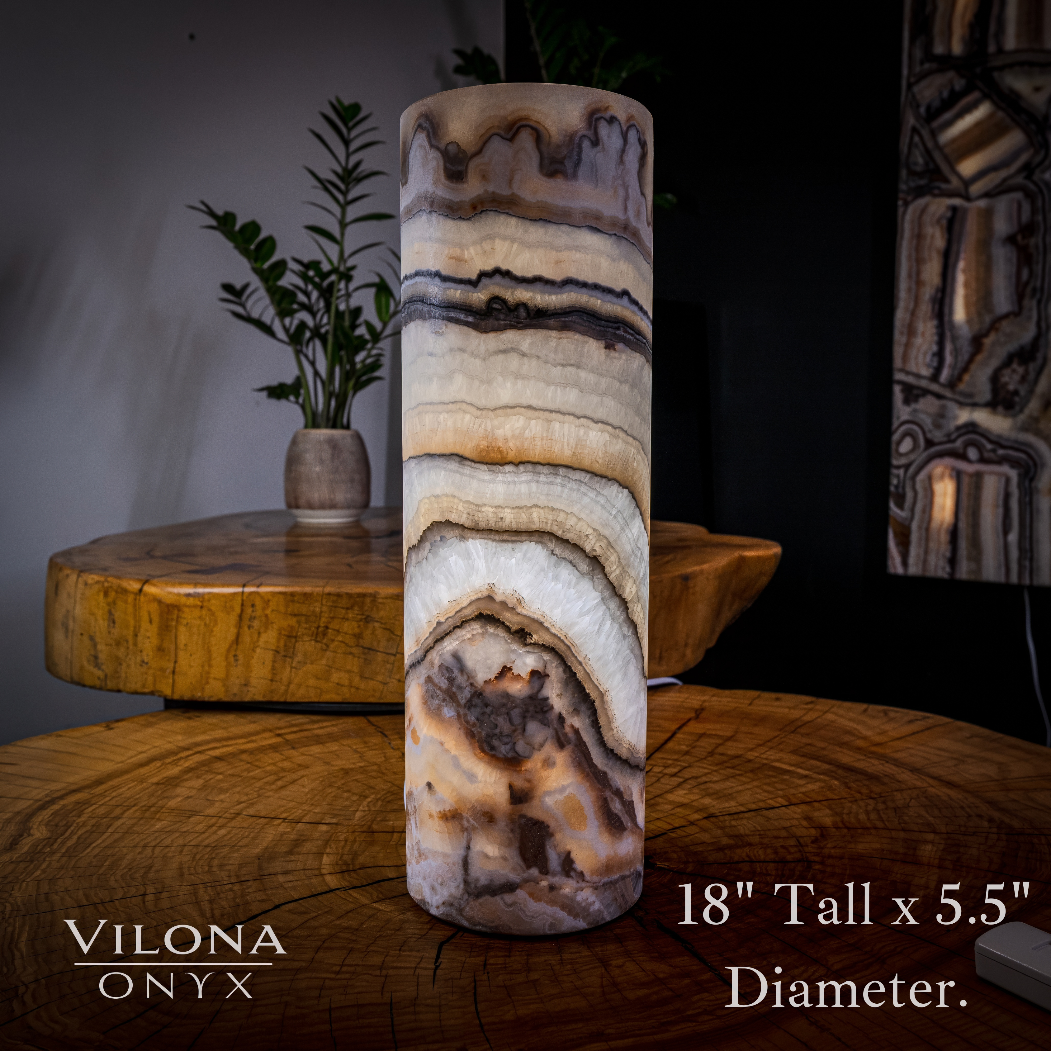 The onyx lamp displayed in this listing (18" Tall, x 5.5" Diameter)