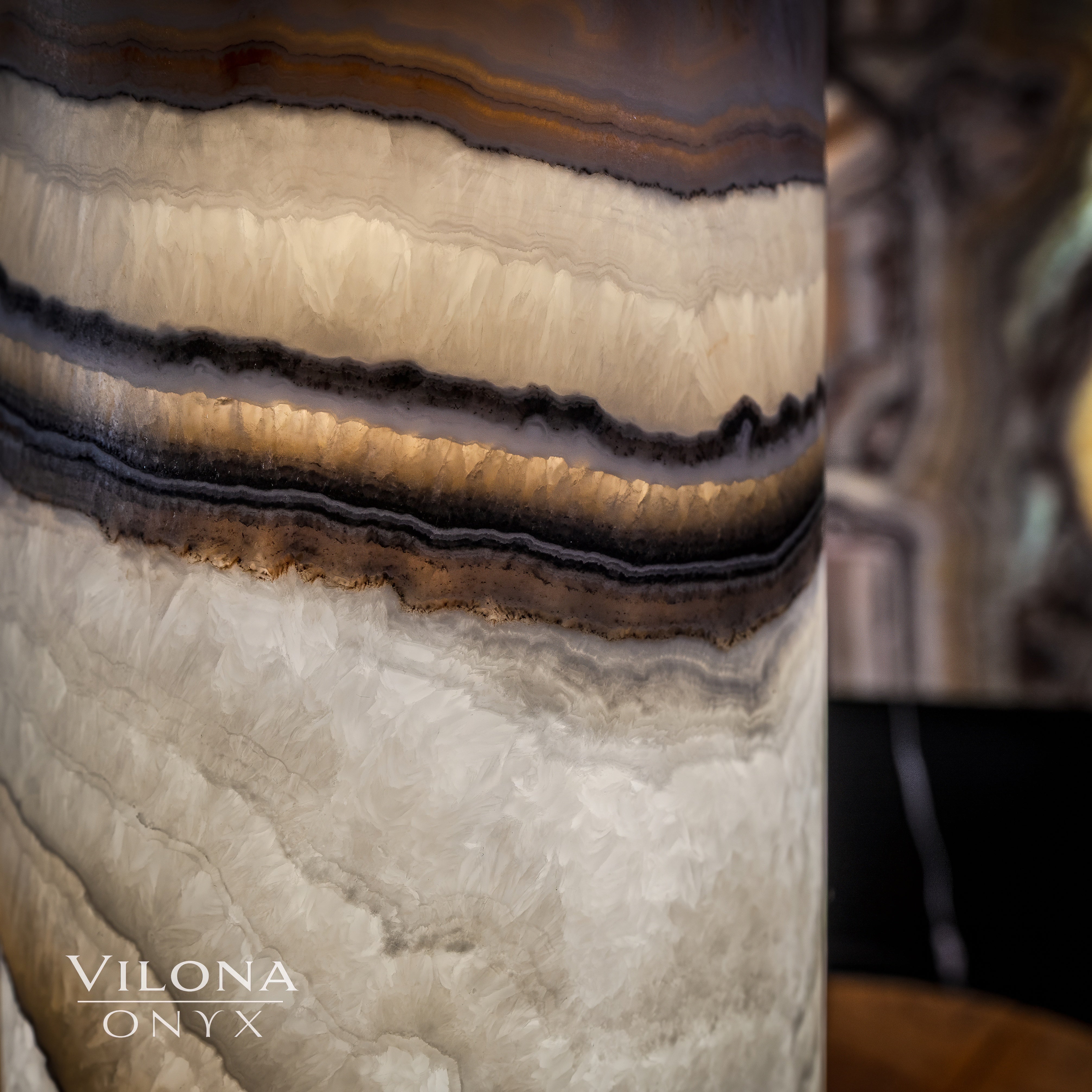 With patterns and colors that are truly breathtaking, the Vilona family features many unique lamp designs and large agate inlaid tables. The stunning contrast of golden hues and beige bands of the stone will add a touch of elegance to any room.