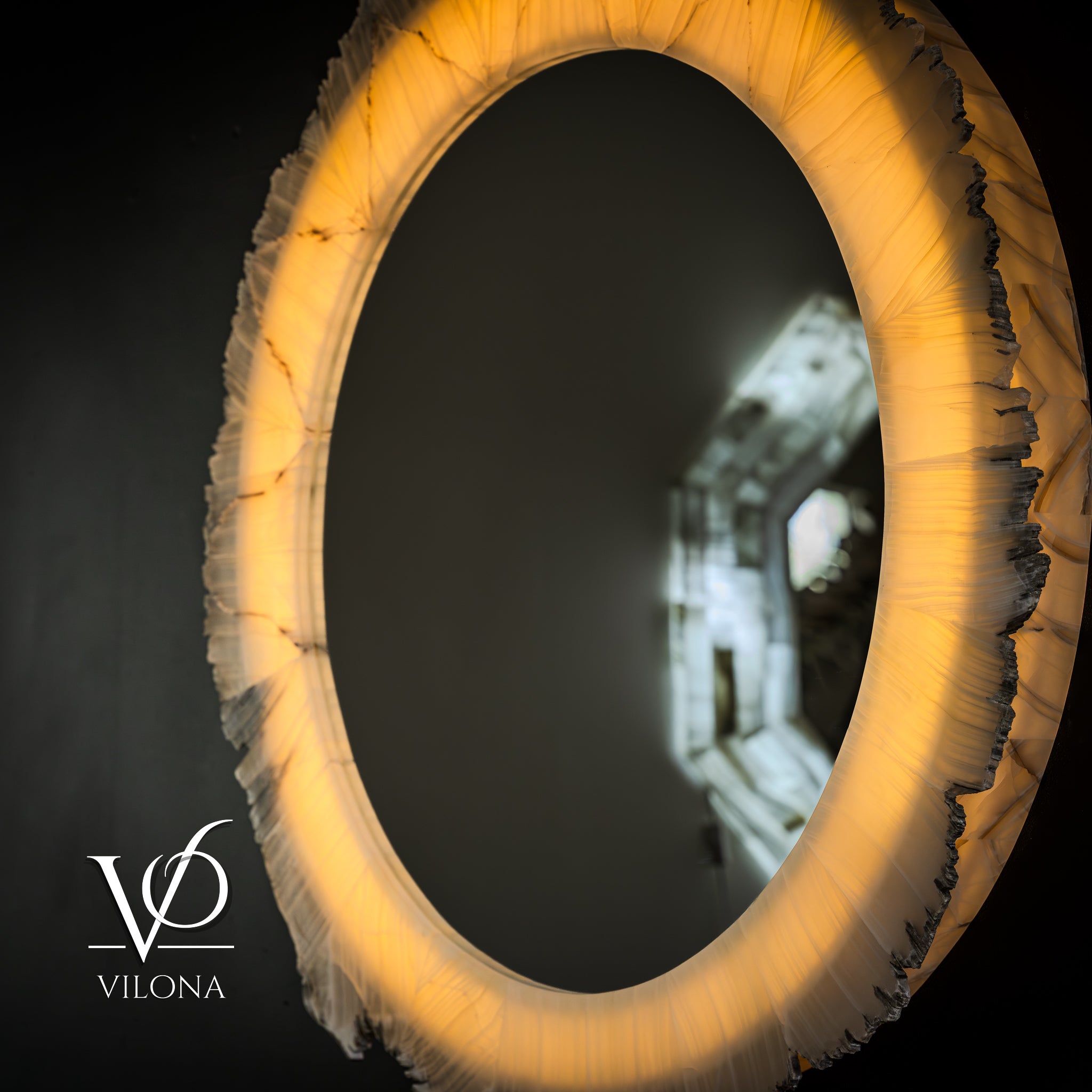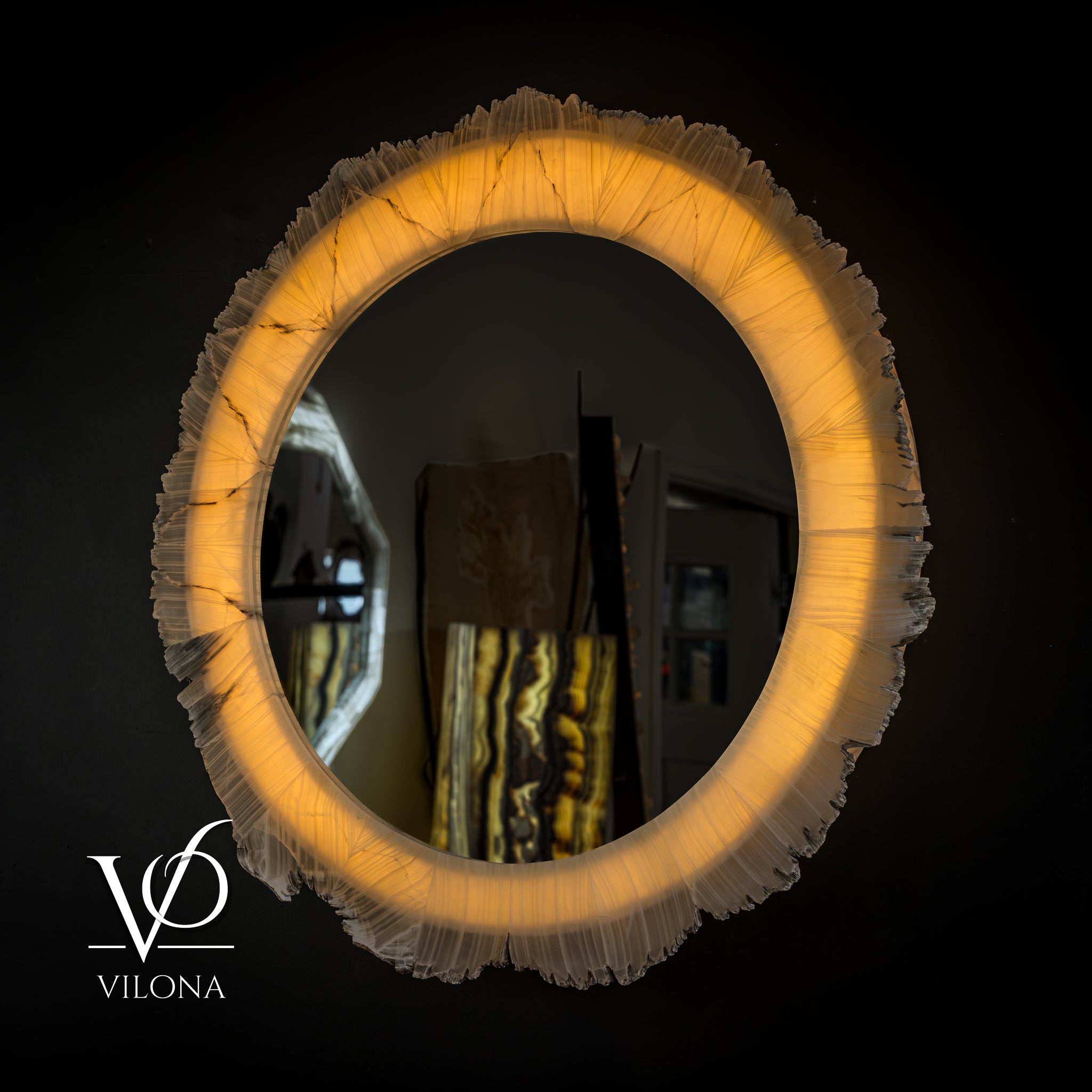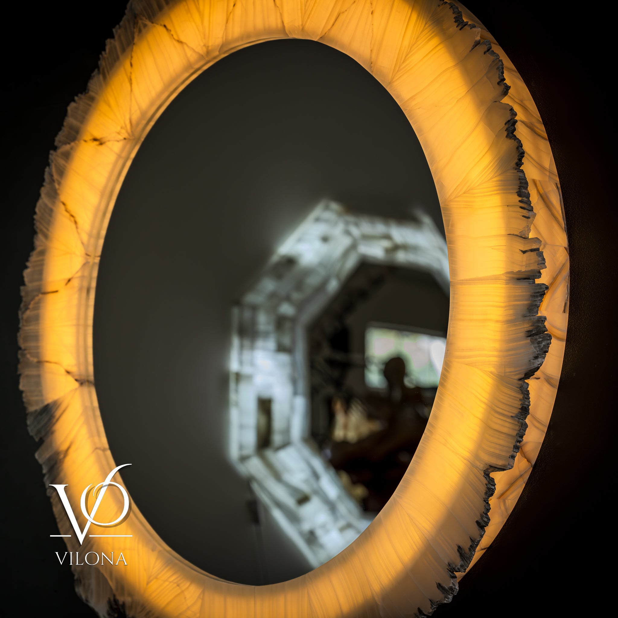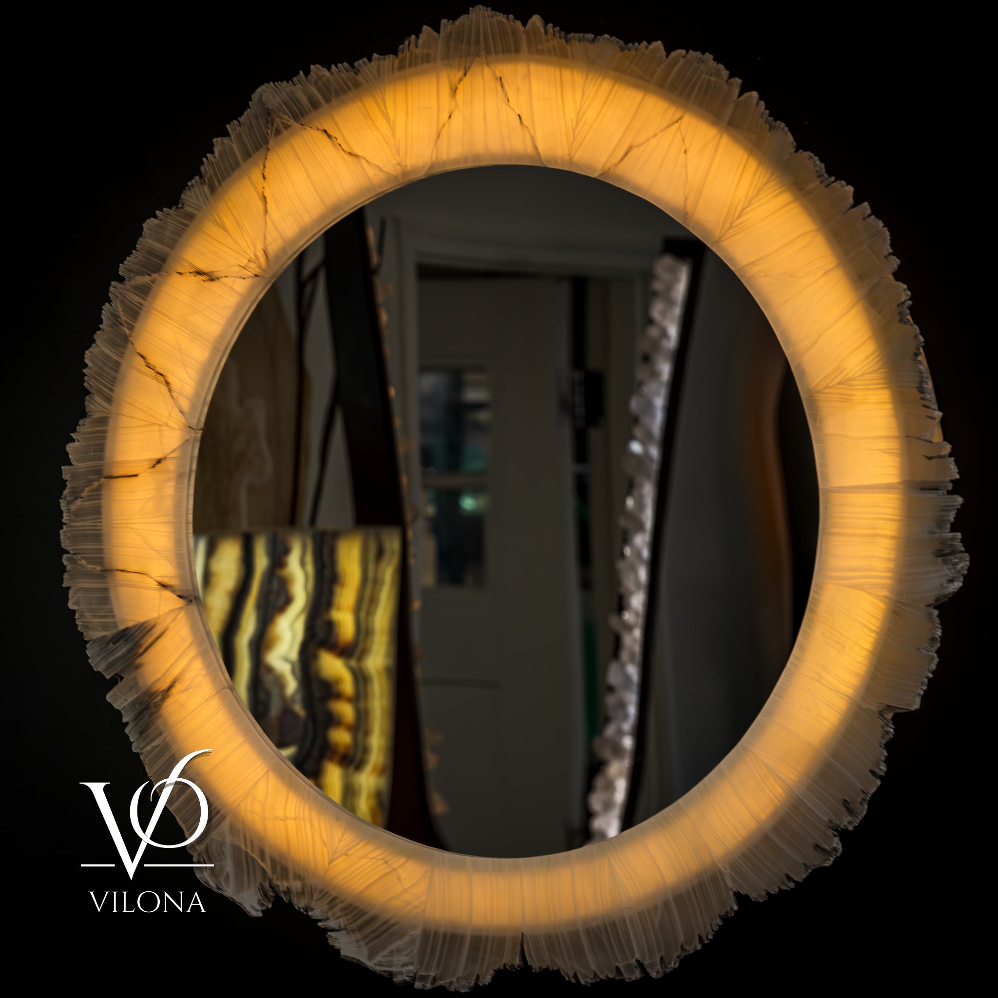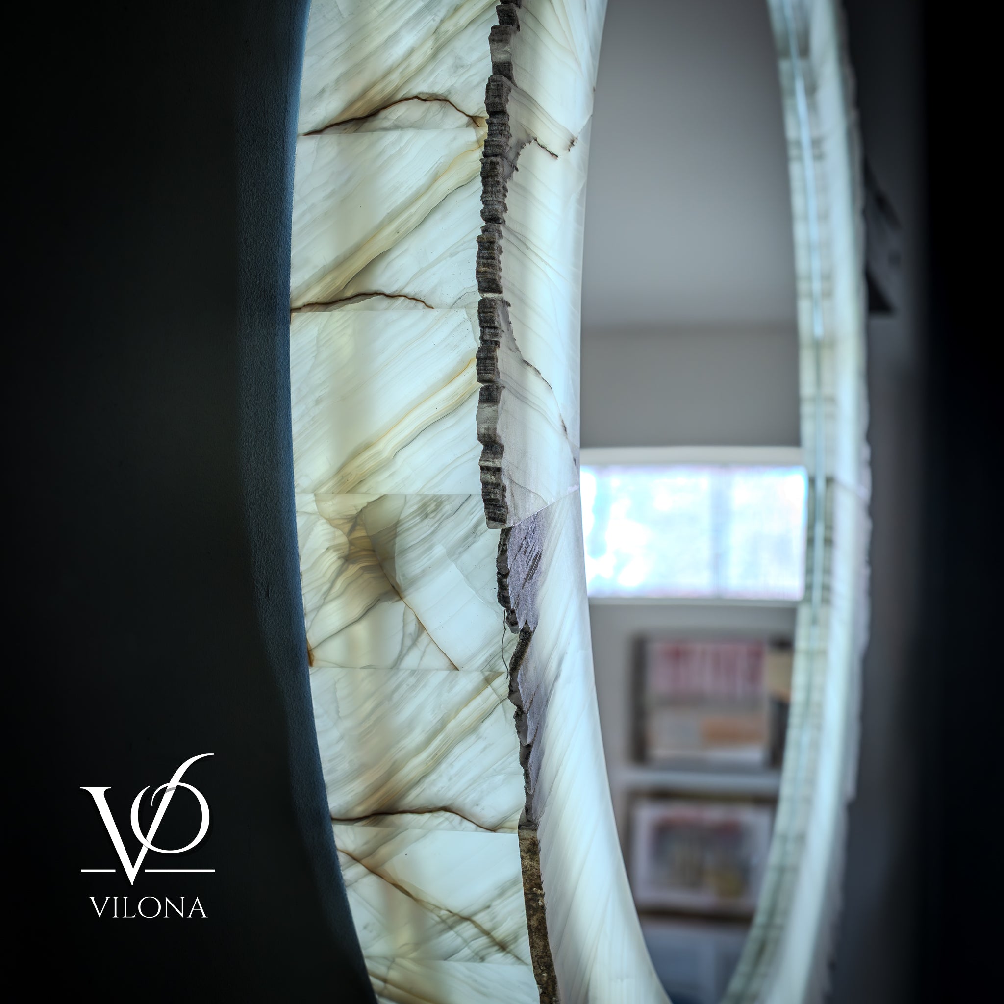 Make a bold statement with this handcrafted Ice Onyx Circle Mirror by Vilona Onyx. Measuring 41 inches in diameter and 4 inches deep, this illuminated natural stone mirror is designed to function as both a practical mirror and a striking work of art for the wall.