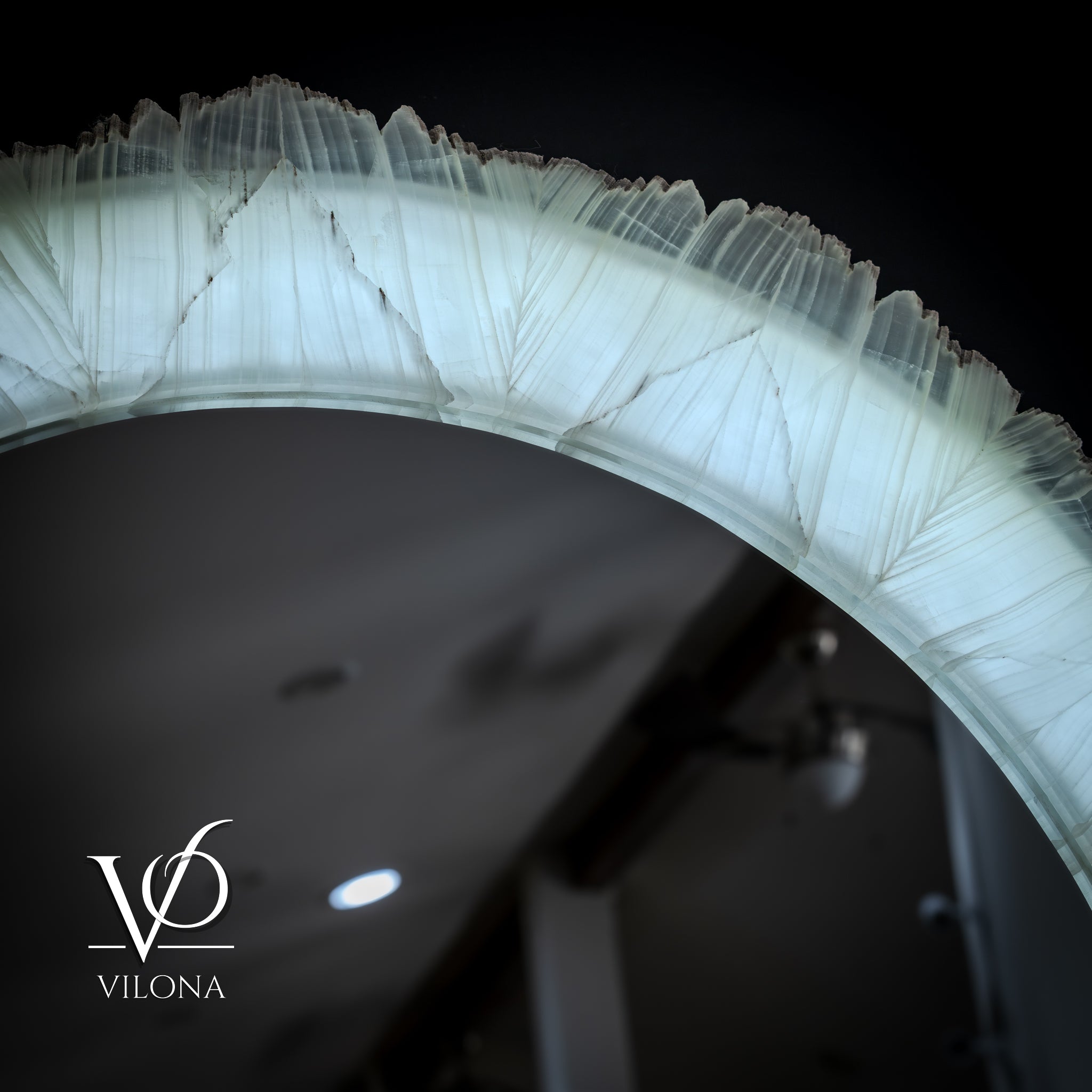 The Ice Onyx Circle Mirror is ideal for those seeking a luxury illuminated mirror, backlit natural stone mirror, statement wall mirror, or one-of-a-kind onyx décor piece.